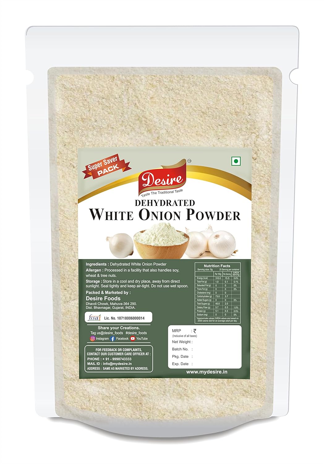 Desire Dehydrated White Onion Powder is made from farm-fresh white onions, dehydrated and finely ground to deliver strong, natural onion flavor.